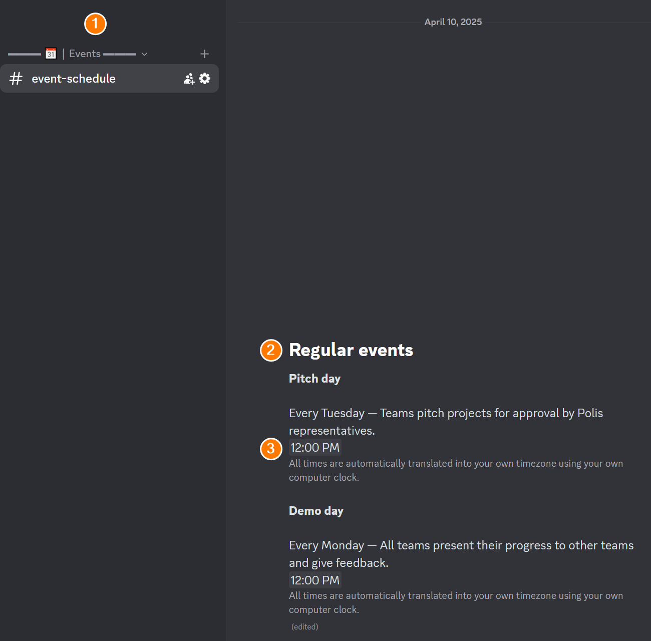 Times (3) are listed in #event-schedule (1) in Discord: